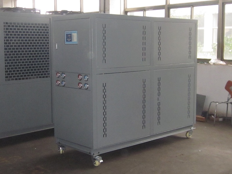 電鍍行業用電鍍冷水機組: 種類電鍍液冷卻,使金屬、非金屬分子穩定.冷水機使金屬分子隨著穩定的電流快速貼附上鍍件表面,增加鍍件的密度和平滑,縮短電鍍周期,提高質量,并可有效地回收化學物質,工業制冷設備同理也適用于真空鍍膜工業 。A.直接冷卻:即鍍液直接通過過濾機或是過濾網進入冷凍機的蒸發器進行降溫再回到氧化槽。此冷卻方式的優缺點:冷卻時間短、效果好;缺點就是蒸發器需要做防腐處理(一般采用鈦合金),蒸發器里容易結垢,需定期清洗,否則影響制冷效果和機器運行。B.間接冷卻:氧化槽里鋪置鈦管,冷凍水通過鈦管帶走渡液熱量達到降溫目的;若鋪鈦管不便可添一換熱器(需是鈦合金制成)一邊走冷凍水一邊走鍍液。